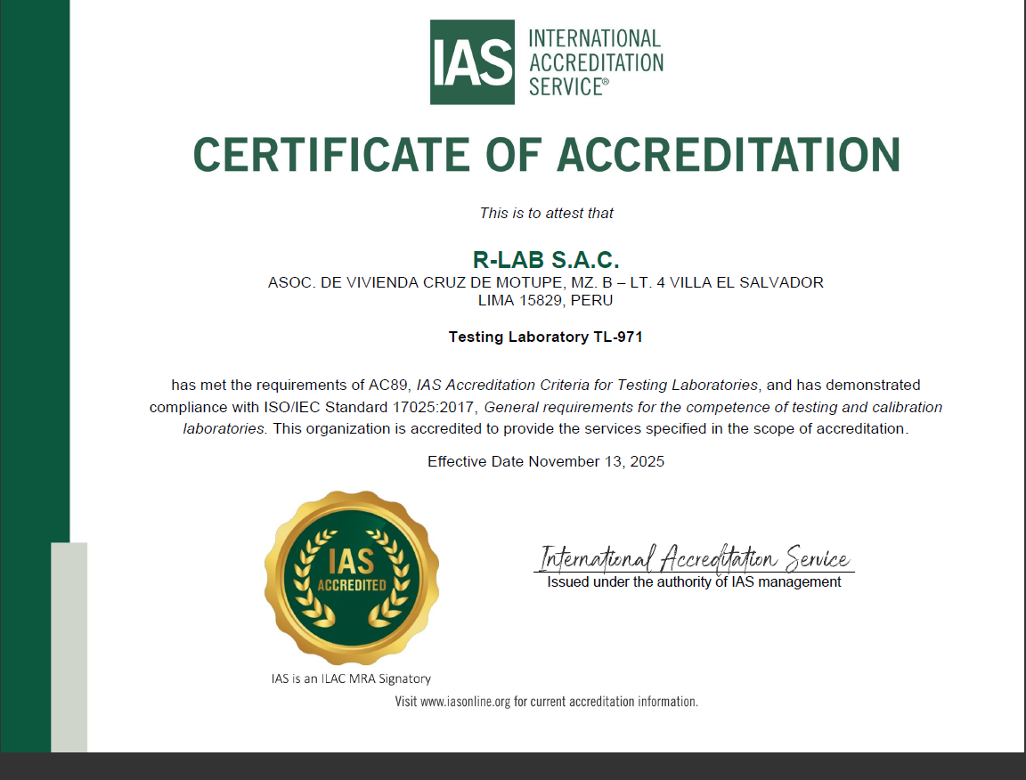 The International Accreditation Service (IAS) nos otorgó la acreditación como Laboratorio de Ensayo bajo la norma ISO/IEC 17025: 2017(Registro N° TL-971)